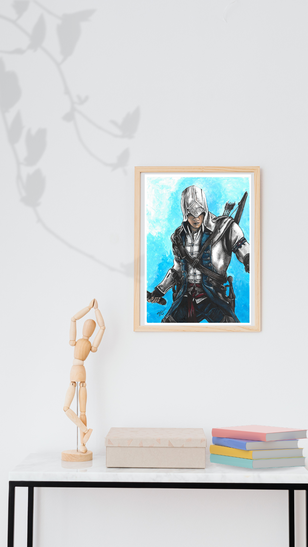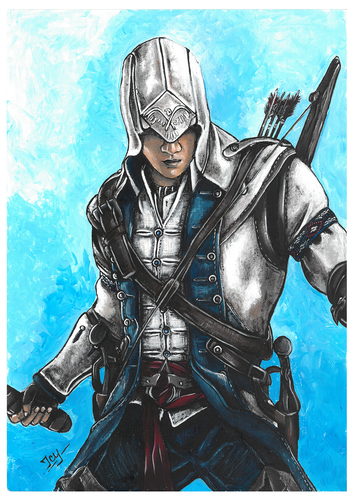 High quality art print of my acrylic painting, Ratonhnhaké:ton from Assassin's Creed 3. Printed on 300 g/m² acid free textured fine art paper, made of 100% cotton with matt coating. The paper is free of white makers and also complies with ISO 9706, which means that the paper can be stored for at least 100 years. It has a strong watercolor structured surface and is explicitly suitable for fine-art reproduction.