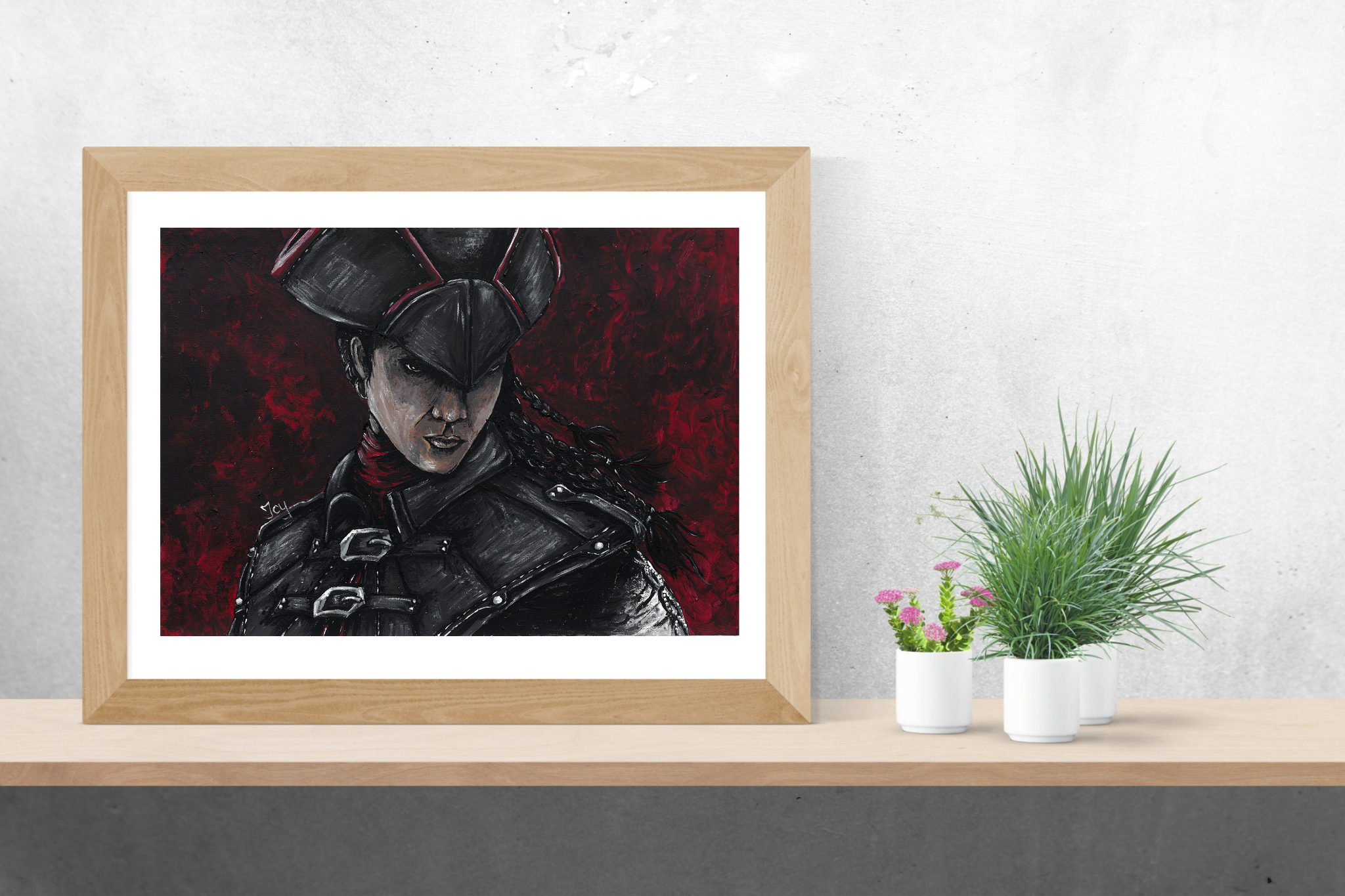 High quality art print of my acrylic painting, Aveline from Assassin's Creed 3 Liberation. Printed on 300 g/m² acid free textured fine art paper, made of 100% cotton with matt coating. The paper is free of white makers and also complies with ISO 9706, which means that the paper can be stored for at least 100 years. It has a strong watercolor structured surface and is explicitly suitable for fine-art reproduction.