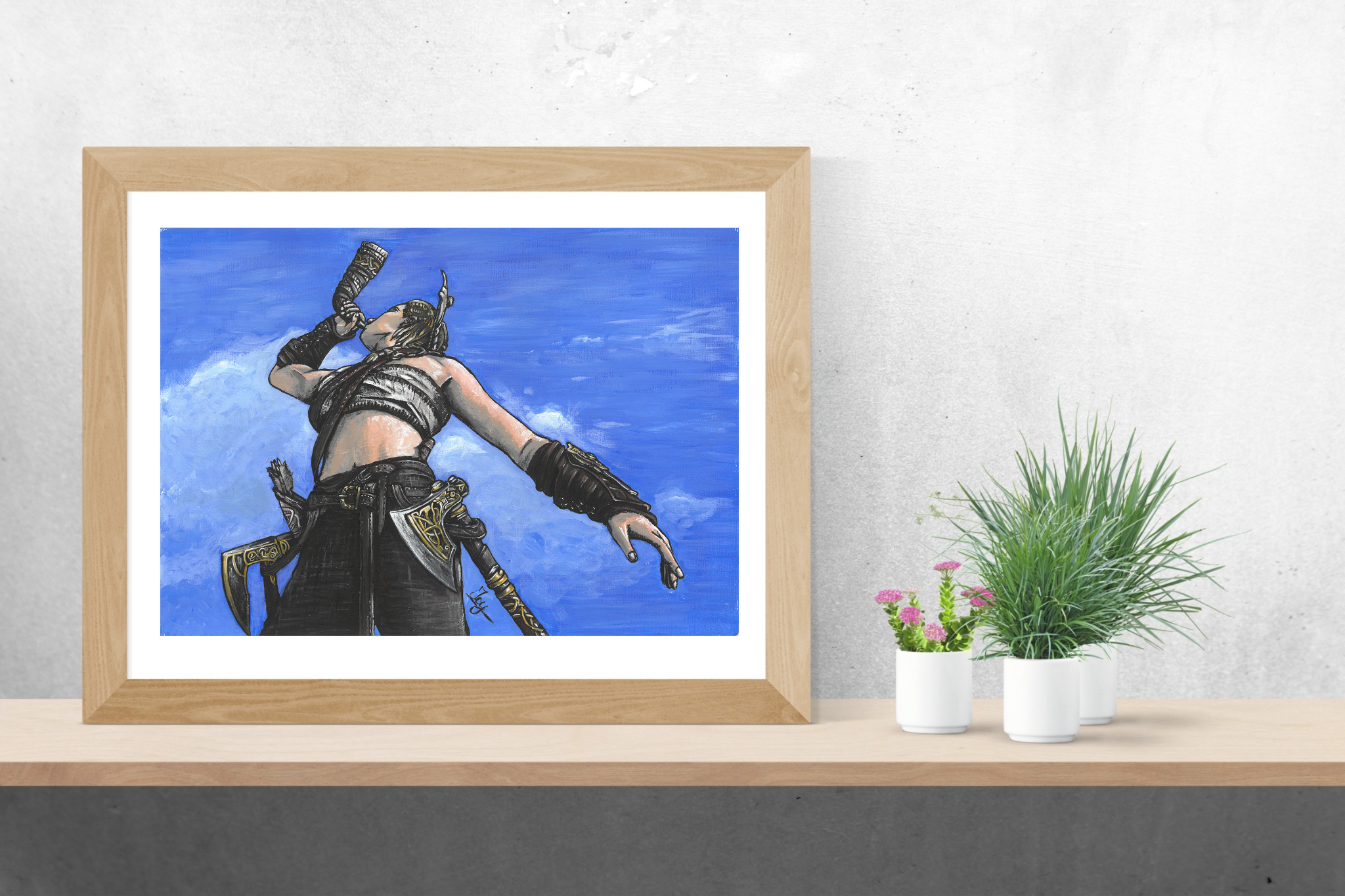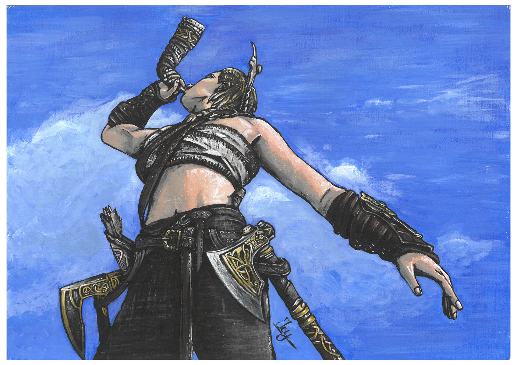 High quality art print of my acrylic painting, Eivor from Assassin's Creed Valhalla. Printed on 300 g/m² acid free textured fine art paper, made of 100% cotton with matt coating. The paper is free of white makers and also complies with ISO 9706, which means that the paper can be stored for at least 100 years. It has a strong watercolor structured surface and is explicitly suitable for fine-art reproduction.