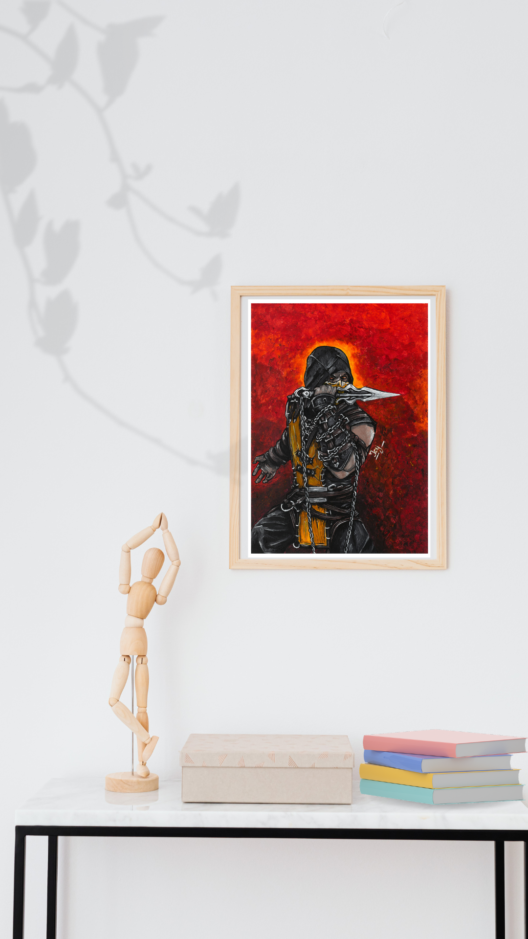 High quality art print of my acrylic painting, Scorpion from MortalKombat. Printed on 300 g/m² acid free textured fine art paper, made of 100% cotton with matt coating. The paper is free of white makers and also complies with ISO 9706, which means that the paper can be stored for at least 100 years. It has a strong watercolor structured surface and is explicitly suitable for fine-art reproduction.