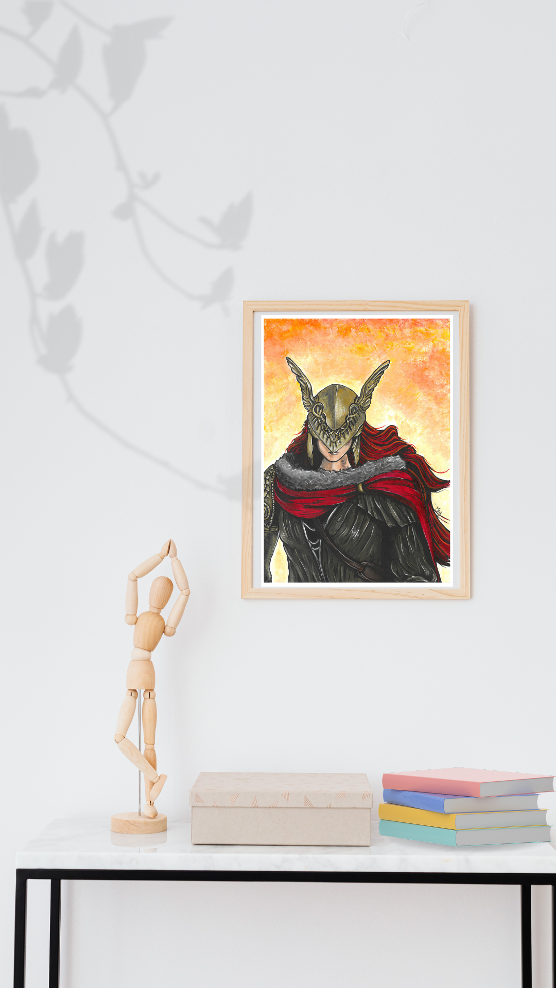 High quality art print of my acrylic painting, Malenia, Blade of Miquella from Elden Ring. Printed on 300 g/m² acid free textured fine art paper, made of 100% cotton with matt coating. The paper is free of white makers and also complies with ISO 9706, which means that the paper can be stored for at least 100 years. It has a strong watercolor structured surface and is explicitly suitable for fine-art reproduction.